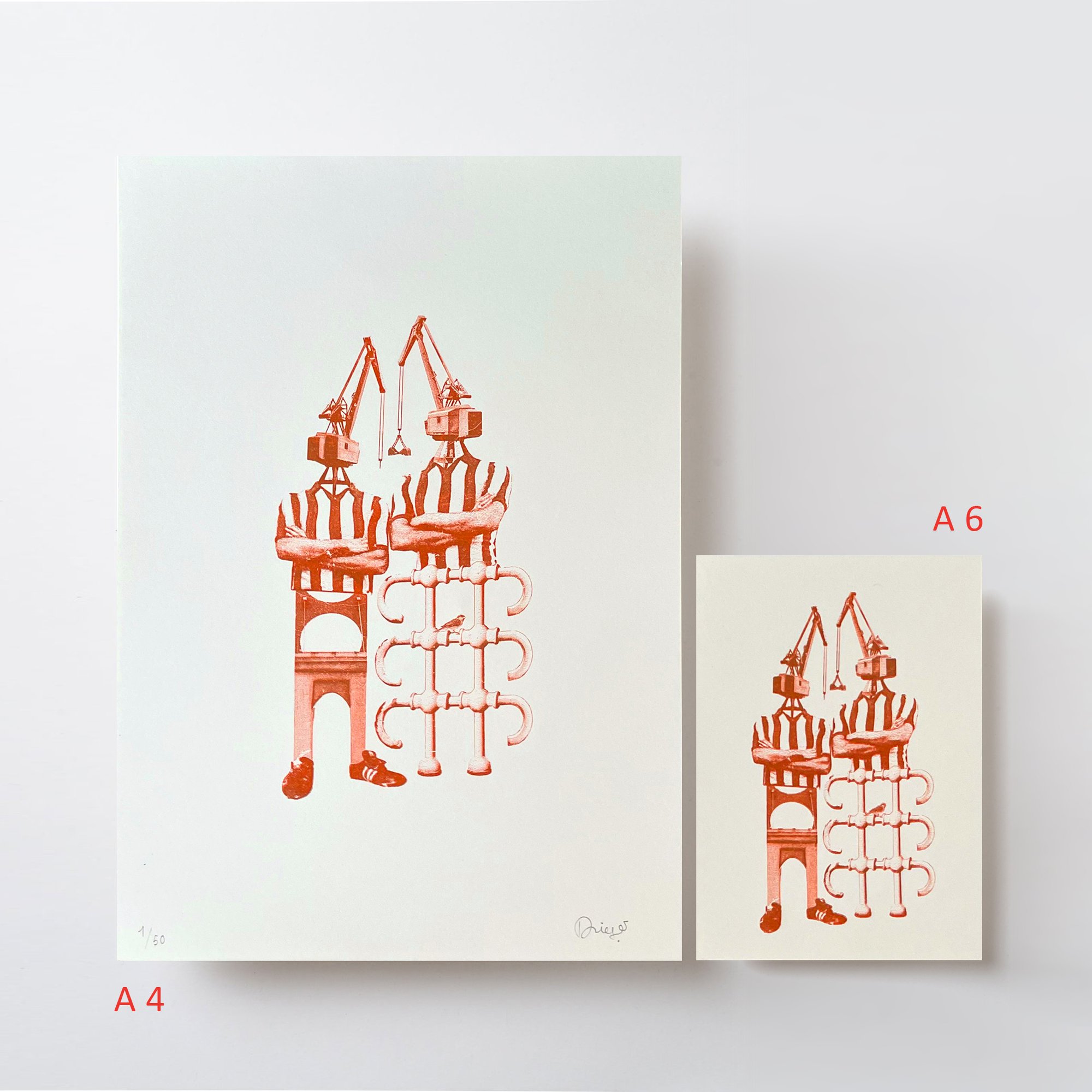 Risograph is a unique printing system, popular for its environmentally friendly printing process and a unique finish of its printed pieces, very similar to those obtained from a photocopying machine. Small faults and ink marks produced by the printing roller are therefore common in prints resulting from this technique. These characteristics all grant a unique character to the piece.